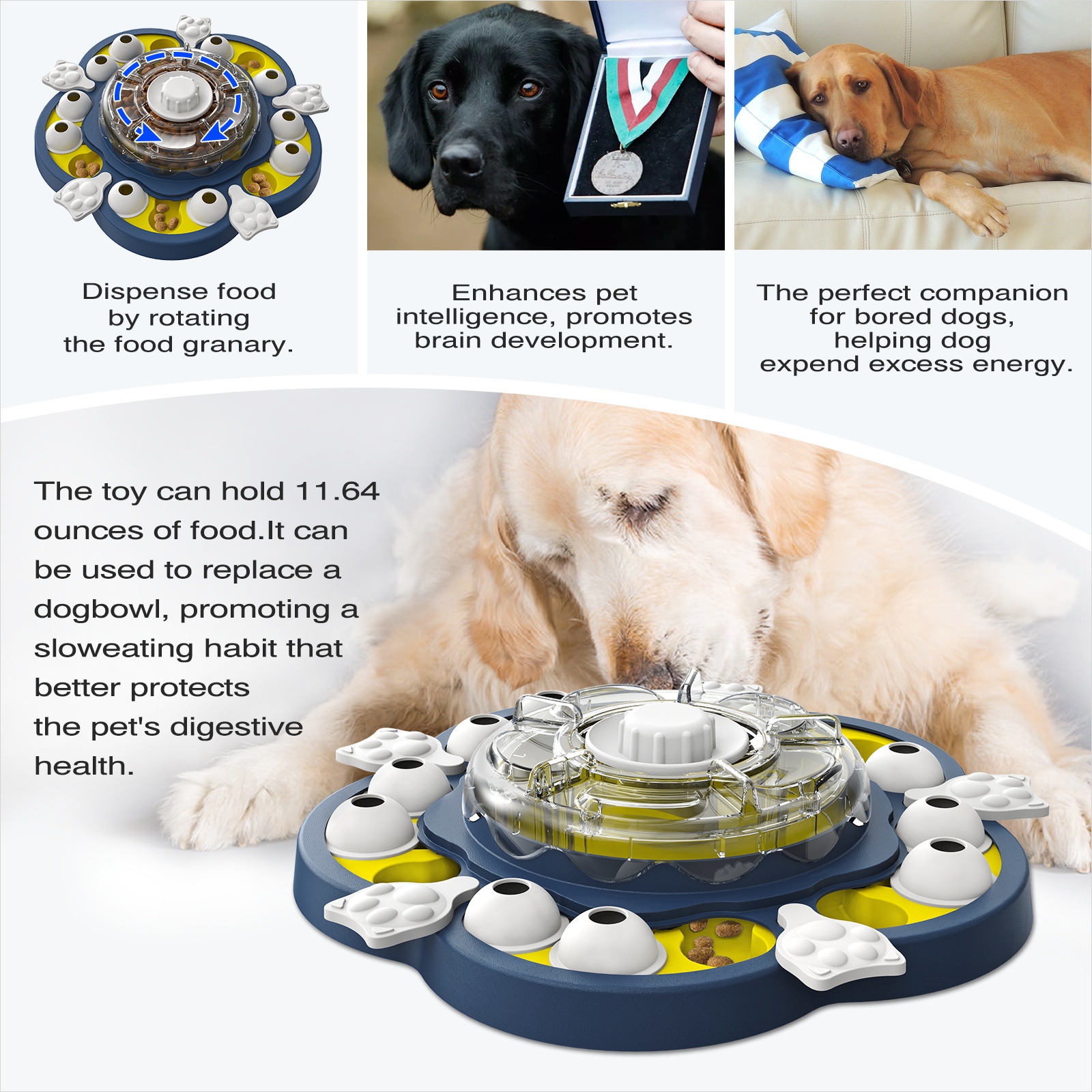 • [Toy from the USA, American Brand with U.S. Patent]This is a perfect dog toy and an exceptional slow feeder for dogs. The toy features a central food dispensing design, requiring dogs to rotate the top cover to release food. It can hold up to 11.65 ounces of pet kibble and incorporates three difficulty levels into a single toy. From Level 1 to Level 3, all difficulty levels are achievable with this one toy. You can select the play difficulty based on your dog's specific needs and abilities.