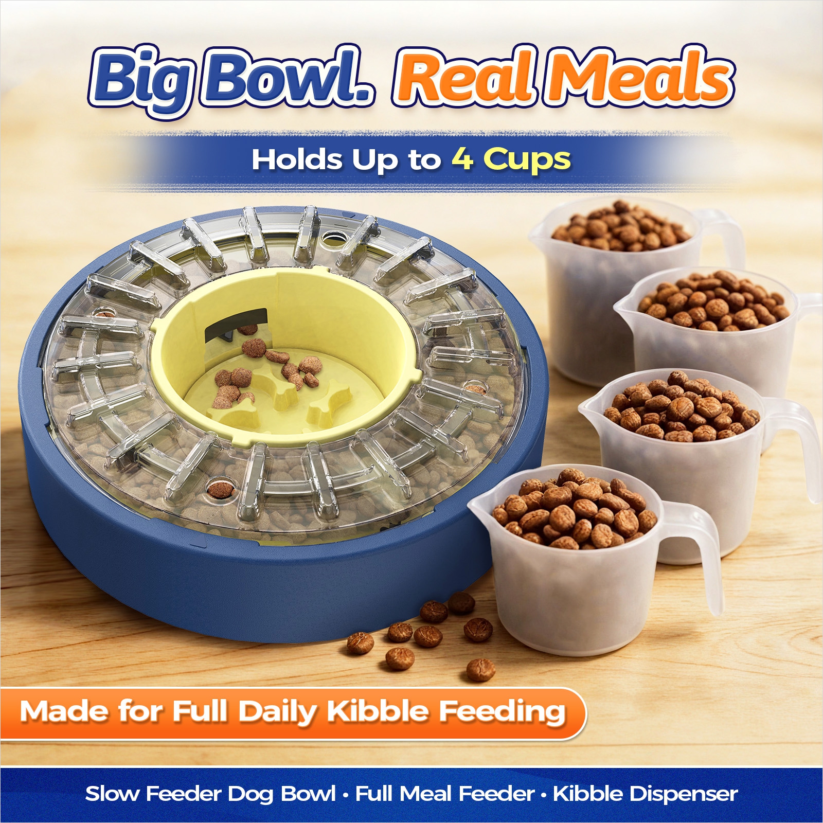 A: It’s a real slow feeder for daily meals. The large food chamber holds a generous amount, so dinner feels more rewarding and less like a race.