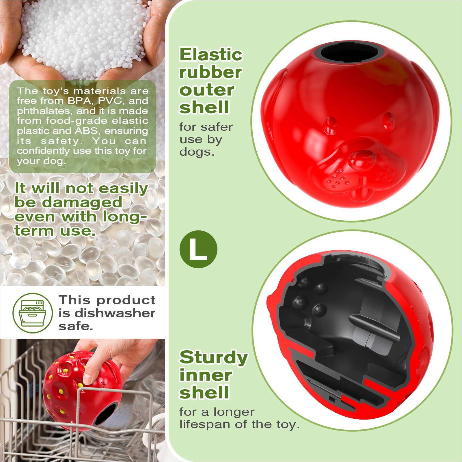 2 [Safe Materials & Double-Shell Design] The toy features a dual-shell construction with an elastic outer plastic shell and a durable inner hard shell. This design ensures safety during use as the elastic exterior prevents mouth injuries, and the robust interior extends the toy's lifespan. The toy's materials are free from BPA, PVC, and phthalates. It's made from food-grade elastic plastic and ABS, which are very safe, you can give it to your dog without concern, allowing for long-term use without easy damage;