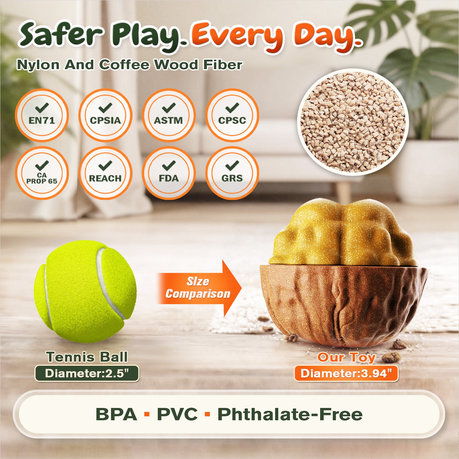 Built with food-grade nylon reinforced with natural coffee wood fiber for a tough, non-elastic chew feel. It’s made for daily enrichment for medium to large dogs—always supervise heavy chewers and replace parts if wear appears (cups are for licking, not aggressive chewing).