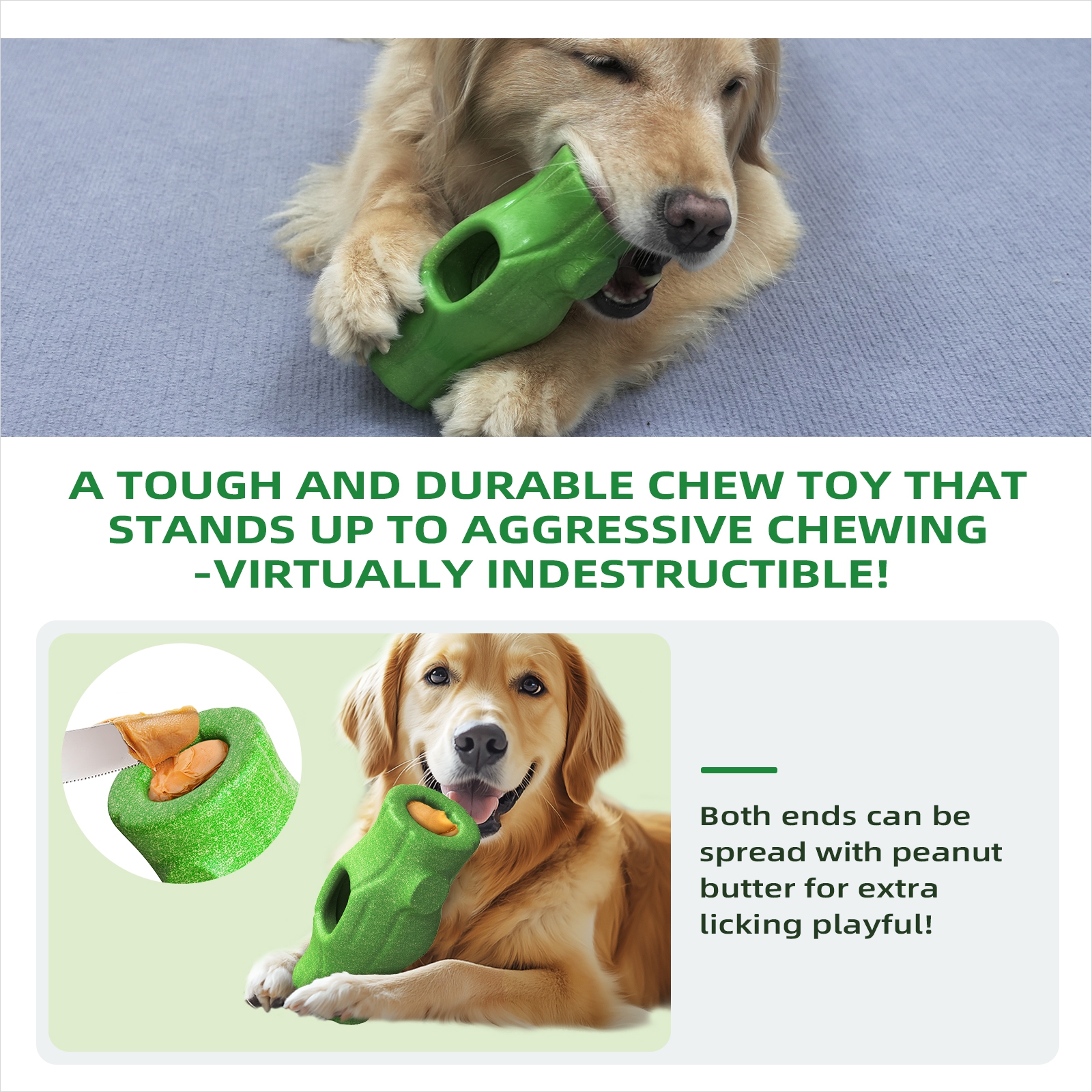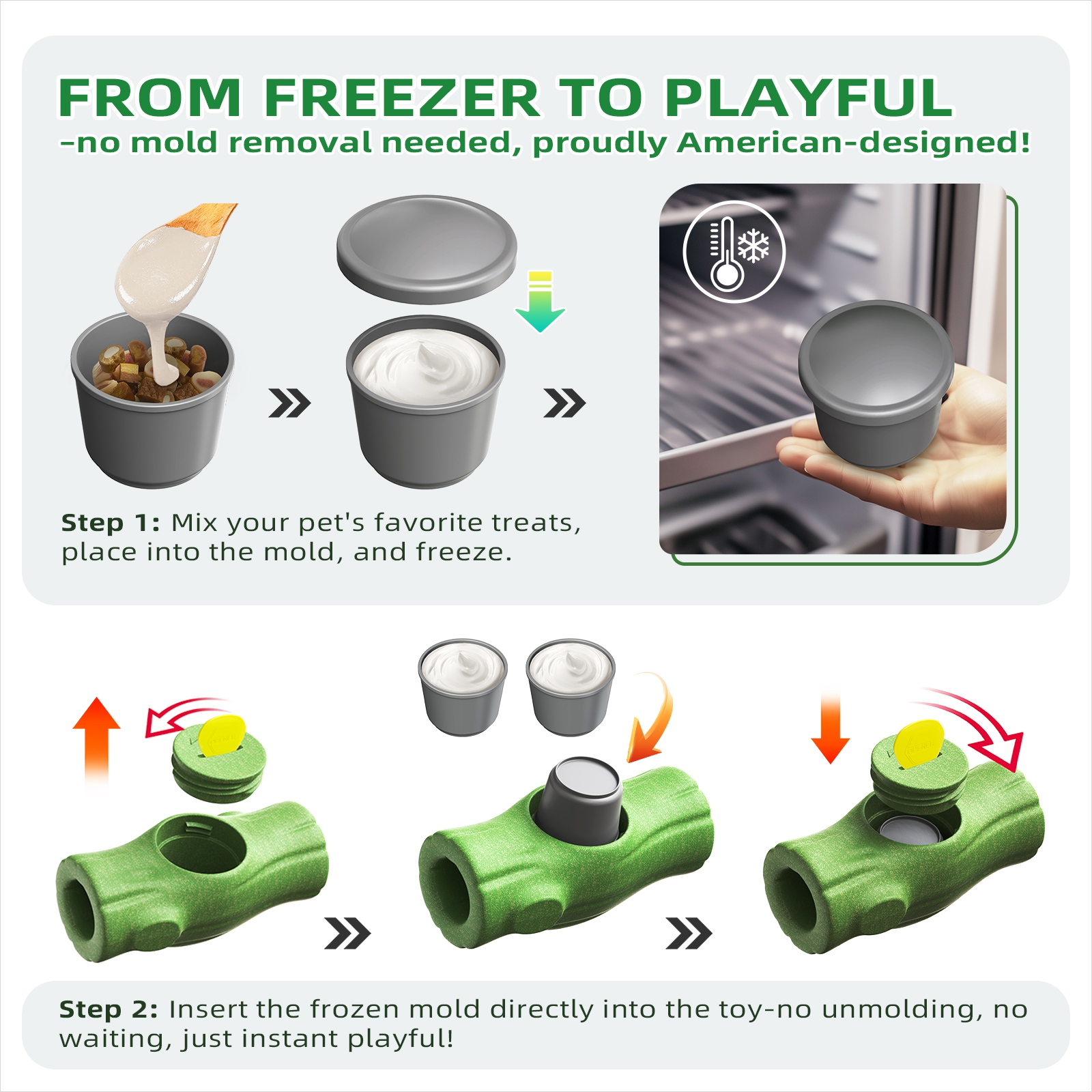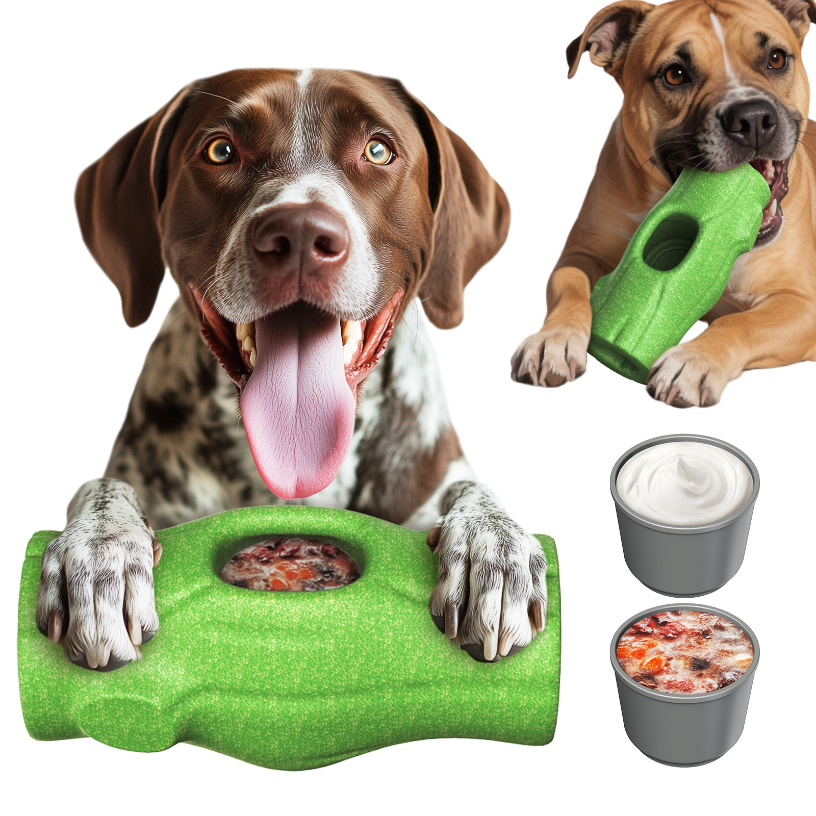 [Innovative Design Dog Toy]This is a versatile and perfectly designed indoor interactive dog toy. Fill the food compartments with mixtures such as meat paste, yogurt, pumpkin, meat chunks, or cheese, then freeze them in the refrigerator. After freezing, insert the food compartment into the toy, allowing your dog to lick and enjoy. This activity keeps your dog engaged, enriches their daily life, and expends excess energy.The toy features grooves on both ends that can hold spreadable treats like peanut butter. Additionally, it serves as a durable chew toy, providing a variety of experiences and enjoyment for your dog with just one product.
