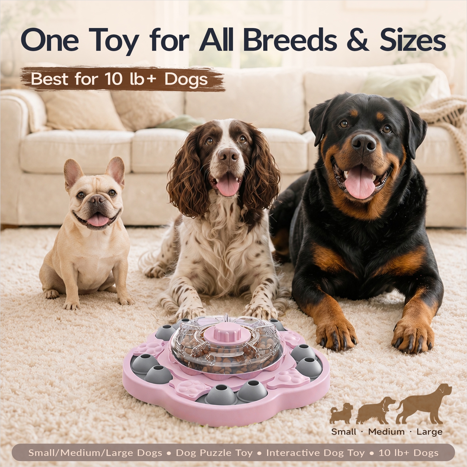 A: It’s recommended for dogs 10 lbs and up. Many owners use it with small, medium, and large dogs, as long as the food size and challenge level match the dog’s mouth size and experience.