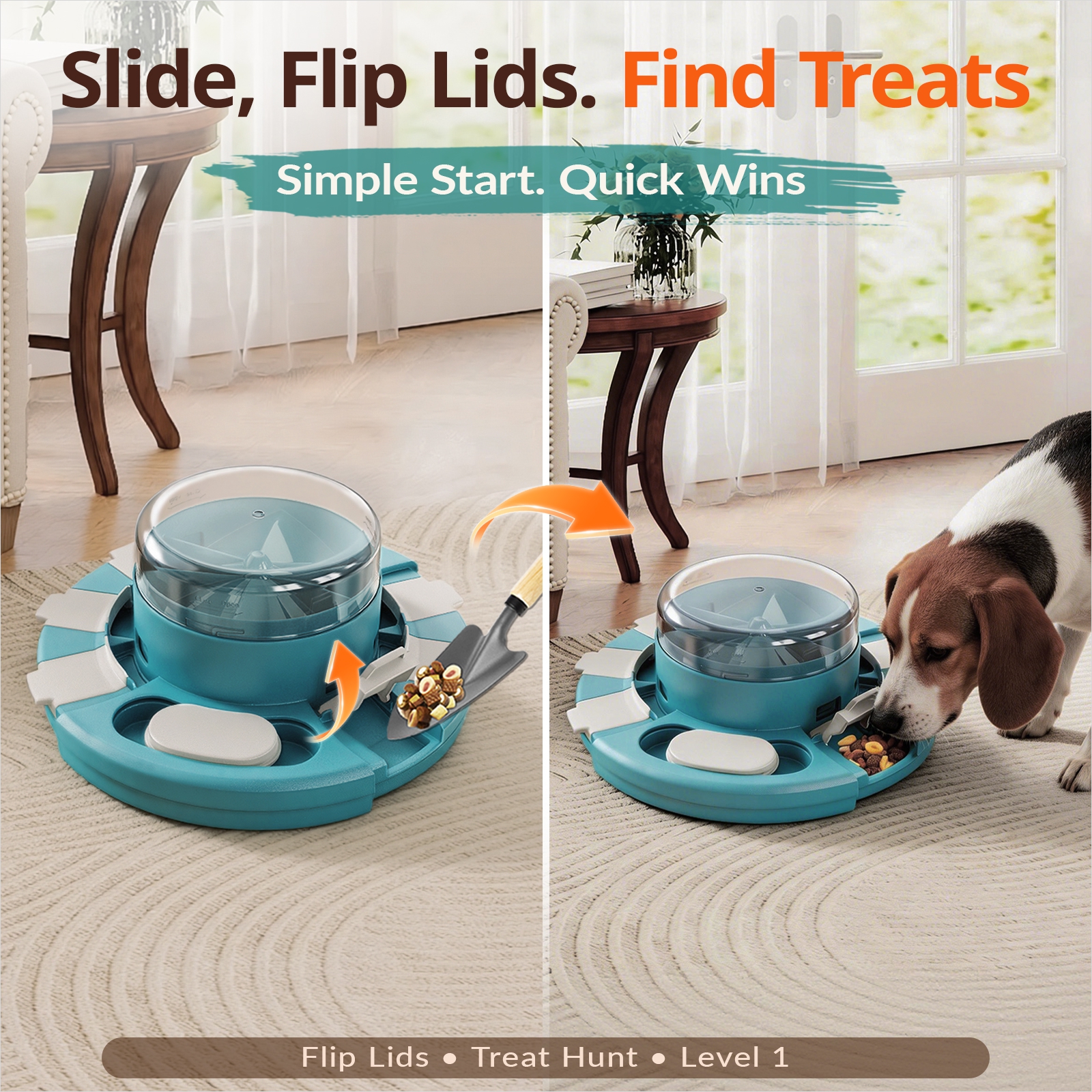 A: 6 flip lids + 2 sliding covers create a “sniff, paw, slide” routine that keeps dogs working.