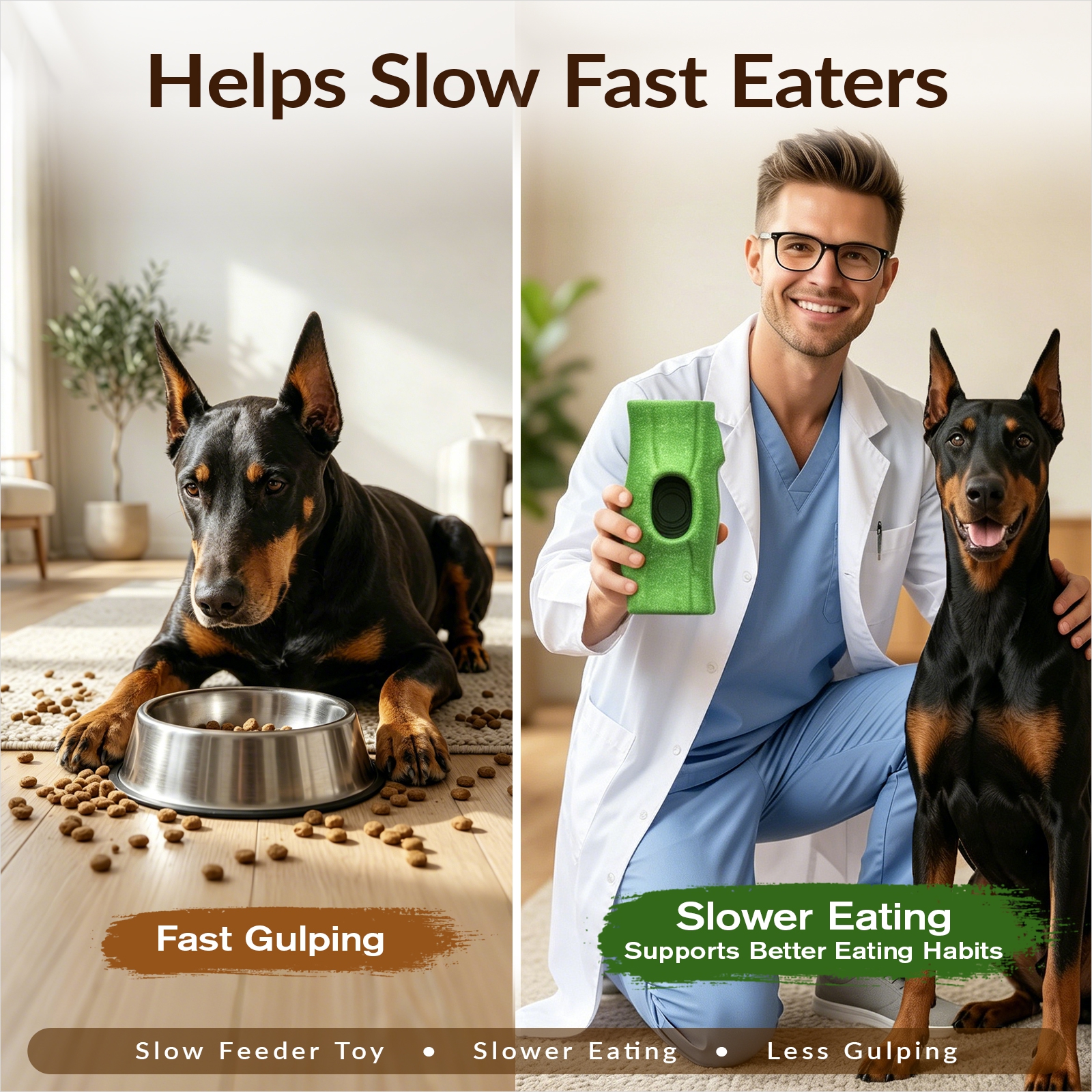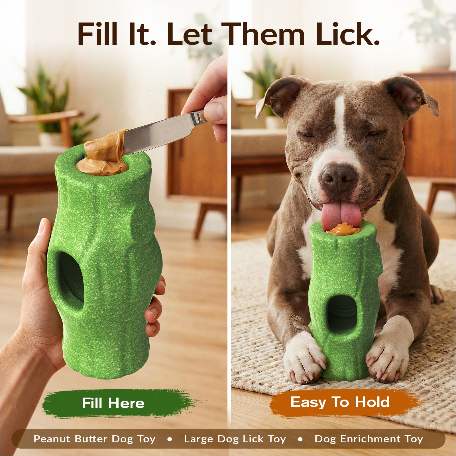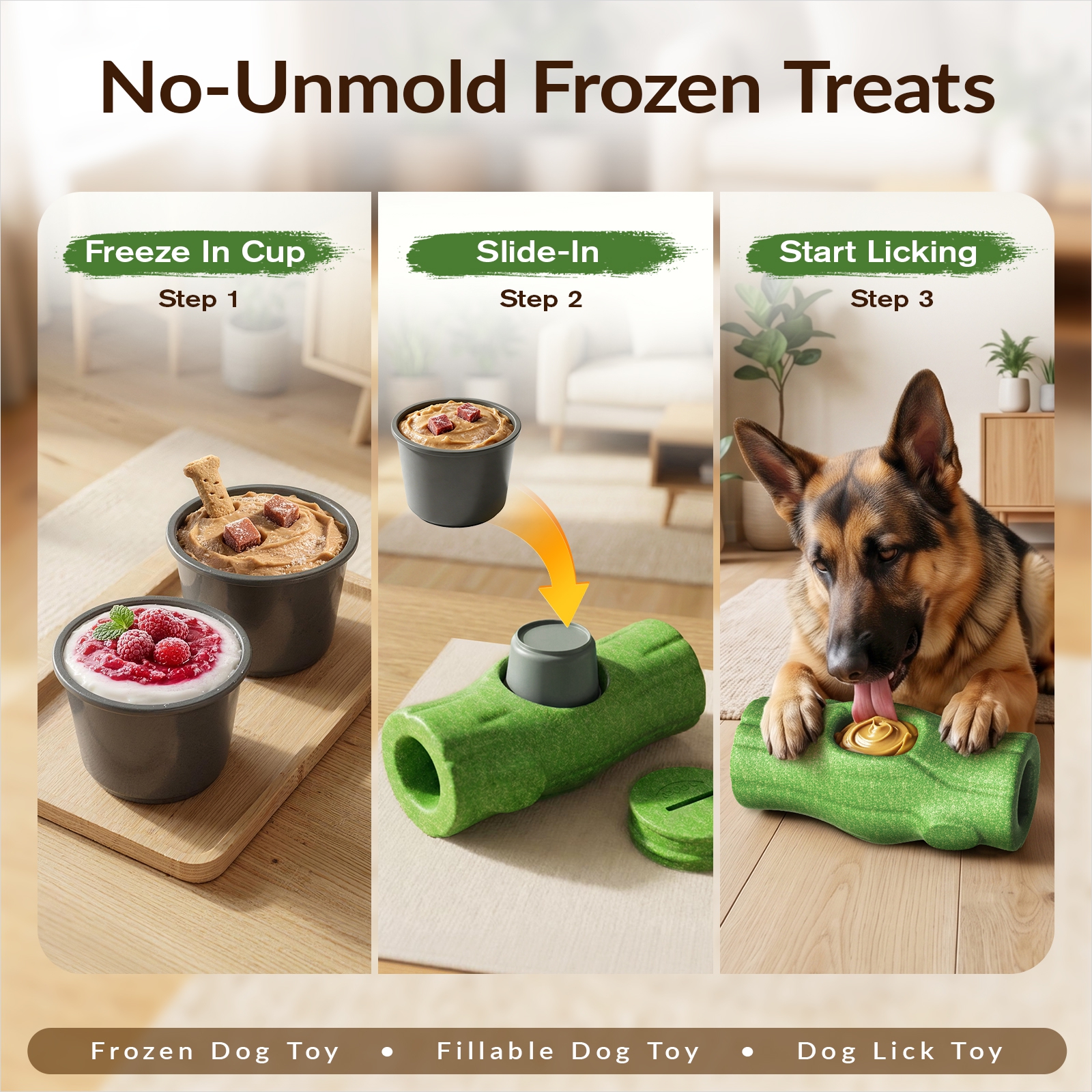 A: The no-unmolding cup, twist-lock design, easy-to-grip stump shape, and tough chew-ready body all work together in one toy. You get cleaner prep, less mess, better control, and longer-lasting enrichment in one smarter design.