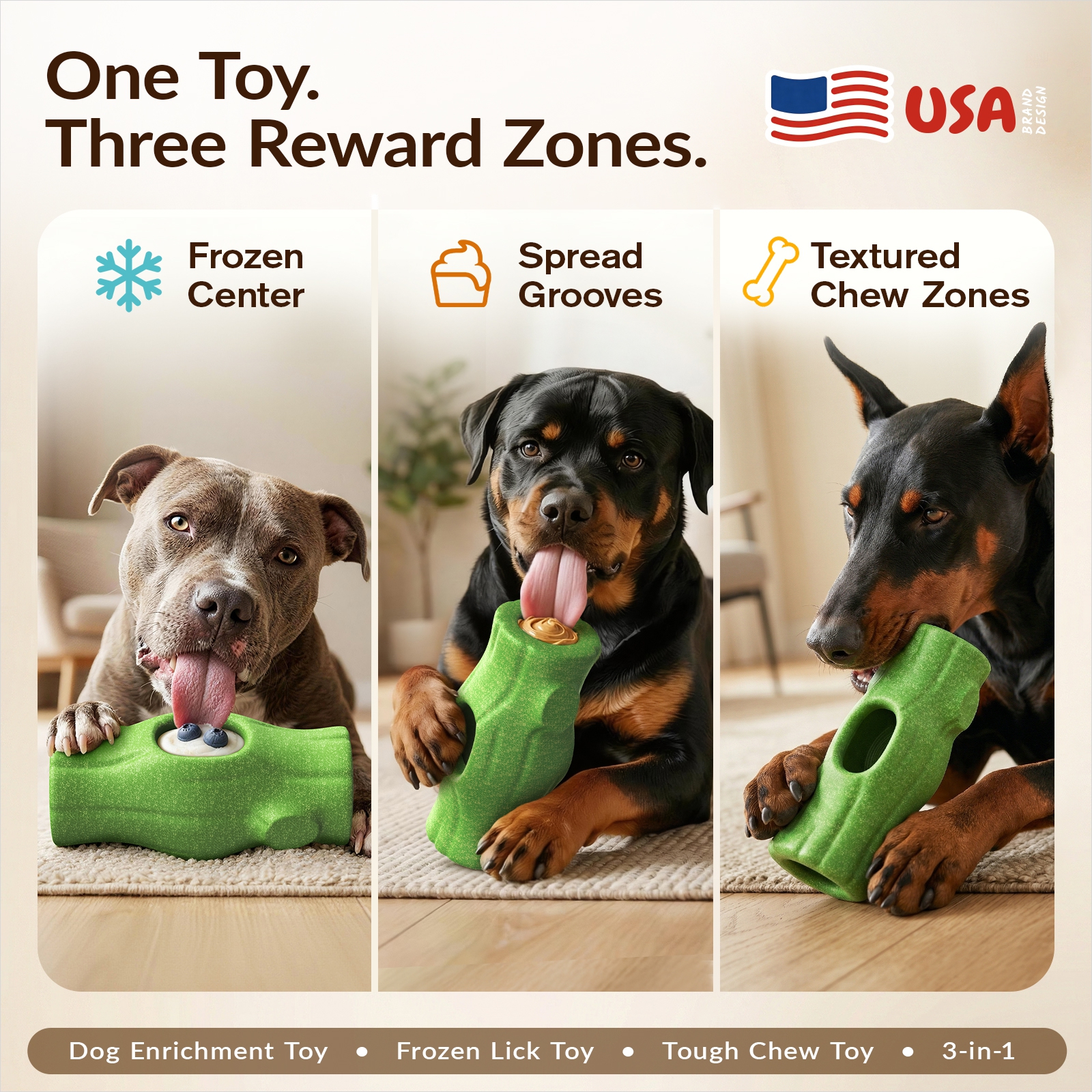 A: The frozen center reward, peanut butter grooves on both ends, and textured chew zones give dogs more to lick, chew, and work on. That added variety helps extend engagement beyond a quick snack.